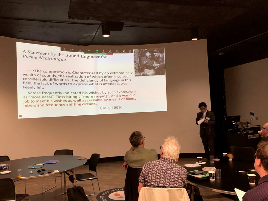 初日のハイライトだったのは、作曲家のクリストファー・フォックス(ジョナサン・ハーヴェイの弟子で、かなり多彩な電子音楽作品を手掛けると同時に、さまざまな雑誌に文章を寄稿している)によるプレゼンテーションで、ここではサブハーモニクスについての彼の探究が披露された。 さて、唯一のアジア人参加者である筆者のテーマは「Sound Engineers as Creators」というもので、つまりは世界の電子音楽の中でも少しばかり特異といってよい、日本のスタジオにおける技術者の貢献についての発表。たとえば「音の始原を求めて」といったディスクのシリーズでは塩谷宏や佐藤茂といったエンジニアがかかわった作品群が、エンジニアの名前のもとに収録されているわけだが、こうした企画はおそらくヨーロッパやアメリカには存在しない。技術者を尊重する風土ゆえなのか(?)、日本の電子音楽の作曲者、および批評家は50年代から、こうした技術者(NHKのみならず、例えば草月ホールの奥山重之助など)の名をほうぼうで記し、その貢献に一定の賛辞をささげてきた。こうした記録、および技術者たちの述懐(例えば電気技術の専門誌などに掲載されたもの)を集めて、そのコラボレーションの様相を再現するというのが発表の目的である。