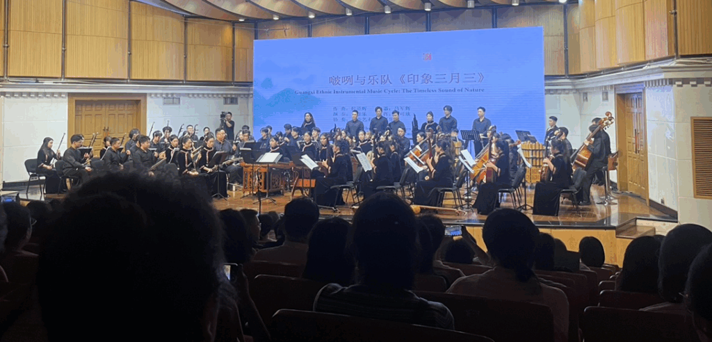 大会2日目のコンサートも刺激的だった。広西芸術学院の学生による踊りの演目や、ステージを埋め尽くす規模の合奏が行われた。ここで簡潔に述べることは難しいほど様々な音楽が目まぐるしく演奏されたが、なかでも中国の伝統楽器による大合奏は非常に興味深かった。編成には中国の撥弦楽器もあれば、二胡を含む擦弦楽器もあり、そして管楽器もあった。さらに、その中にはチェロやコントラバス、ティンパニといったクラシックオーケストラの楽器も混在していた。見たことも聞いたこともない、その編成用の合奏曲がコンサートのトリだった。とてつもない音量に包まれ、華やかな衣装や目新しい楽器に意識を奪われていると、あっという間にコンサートは終わってしまった。