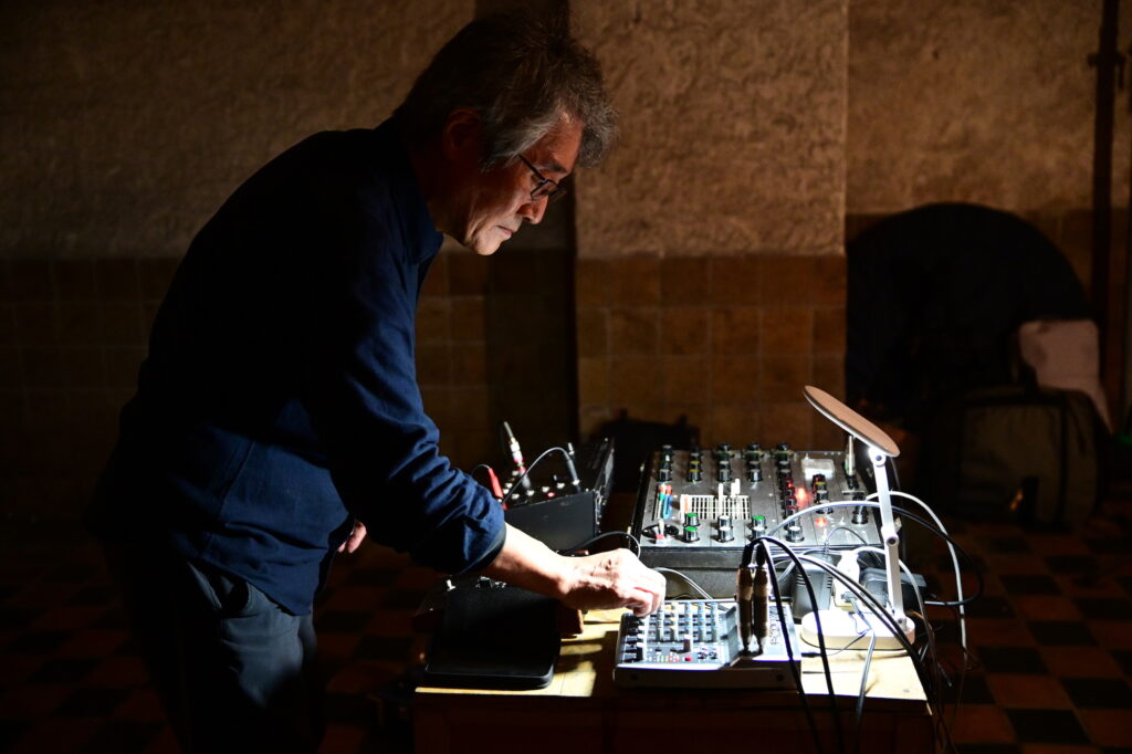図3:2025年5月18日に金沢市の石黒ビルで開催された演奏会「肌触れる風、水流れる体内」においてエレクトロニクスの操作をする島田英明