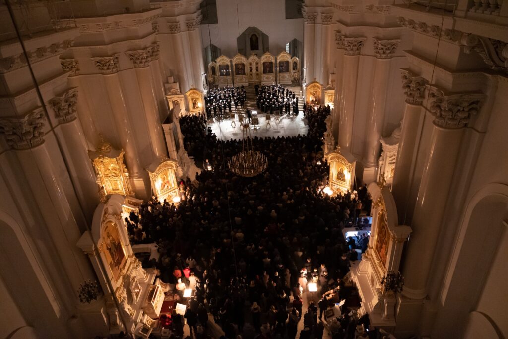 合唱団とクルレンツィス、そして司祭が登場。司祭は挨拶に続けて誦経に入る。聖歌が応答する。やりとりが十数分続いた後、自然とラフマニノフの《徹夜祷》に流れ込む。普段、コンサート・ホールを「聖堂」にすると評されるクルレンツィスが、今度は文字通り、聖堂で祈りと音楽を一体化させたのだ。とはいえ、さすがに徹夜はしない。《徹夜祷》に入ると司祭は退き、作品だけの時間になった。その代わり、晩課(第1–6曲)、早課(第7–14曲)、一時課(終曲)と進むにつれ、暗闇から陽が昇るかのように照明が明るくなっていった。