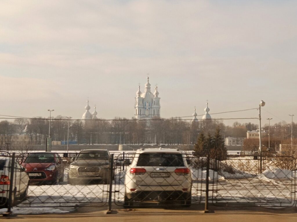 この聖堂は私にとって、ペテルブルグのシンボルだ。留学中に住んでいたのは中心部からずっと遠い、ネヴァ川を超えたはるか先だった(音楽院までバスで1時間半)。市街地側の川沿いに位置するスモーリヌィ聖堂は、橋を渡るとき車窓からよく見えた(写真は比較的天気の良い日に対岸のバスから撮ったもの)。灰色の空ばかりのペテルブルグでも、夜になればライトアップされて白と水色の美しい外装が浮かび上がる。だから夜の姿の方が記憶に残っている。指導教官との面談で絞られた週末、期待外れだったコンサートの帰り道。曇ったバスの窓ガラス越しにぼうっと浮かぶスモーリヌィの輪郭を、振りかえって見つめるのが好きだった。